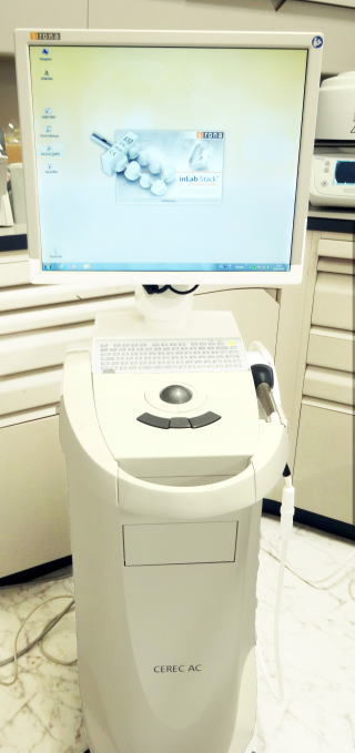 治療する歯を削った後、3D光学カメラを使用して患歯を撮影し、コンピューターに取り込んで設計します。その後ミリングマシーンで設計どおりに削っていきます.